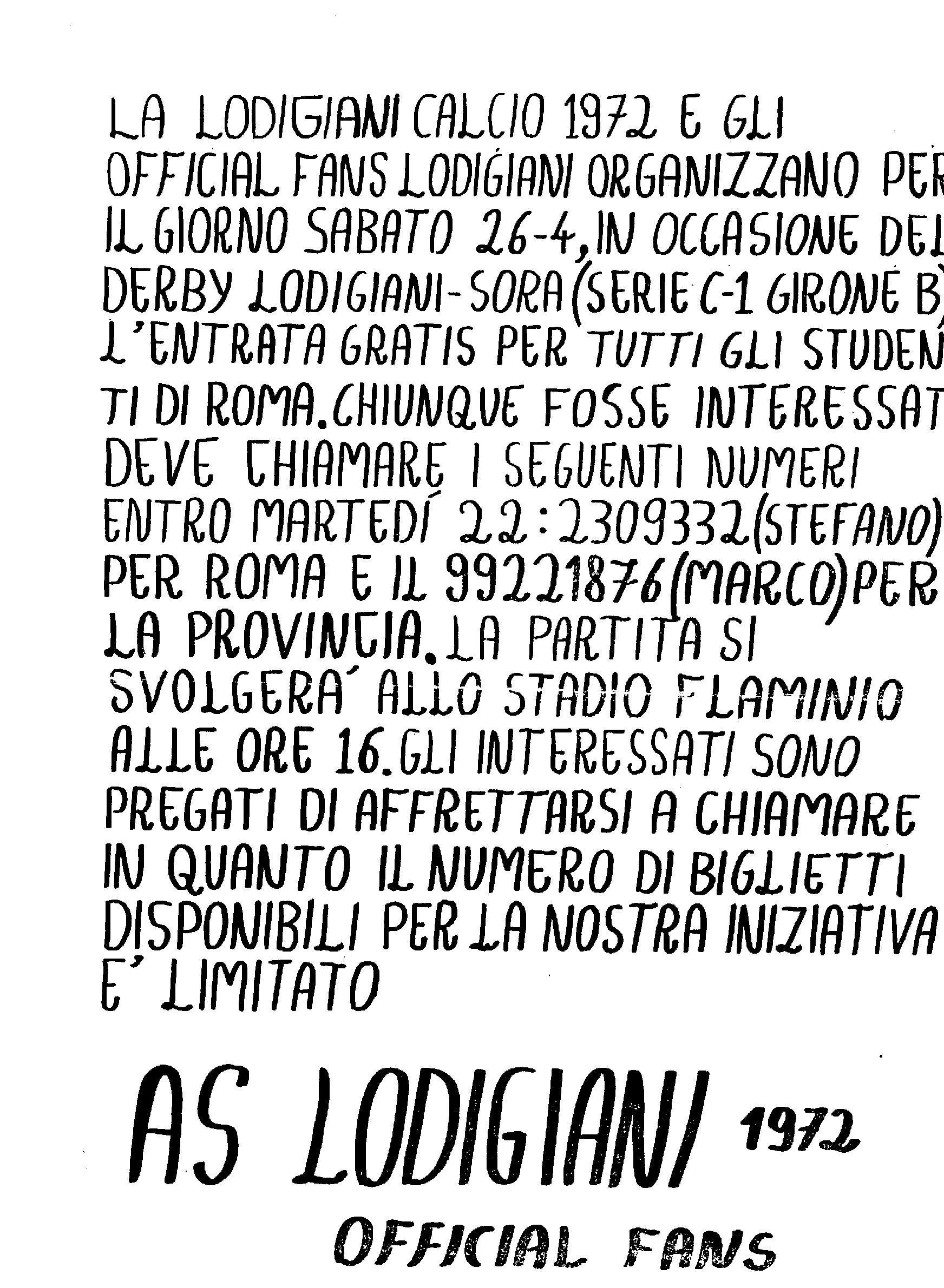 Il volantino, realizzato in formato A3, riguardava la nostra iniziativa, coadiuvata dalla società, di entrata gratis per gli studenti in occasione di Lodigiani-Sora 96/7. L'iniziativa ebbe un grosso successo.
